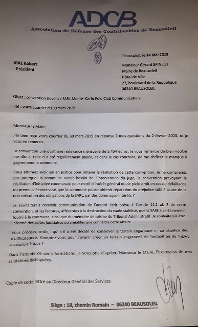 C'est le 14 mai 2015 que l' Association de Défense des Contribuables de Beausoleil a écrit au maire de Beausoleil, Gérard Spinelli pour demander des comptes à propos des sommes impayées à la commune par le Monte Carlo Polo Club.Comme le souligne Robert Vial, le président de l'Association de Défense des Contribuables de Beausoleil, les faits sont troublants.
