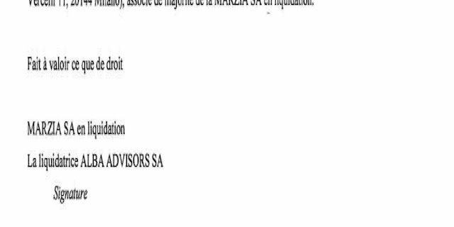 En ma qualité d’associé majoritaire de la société MARZIA S.A. en liquidation, sise à Lugano (CA), possédant cinq actions (sur huit) de la société précitée,