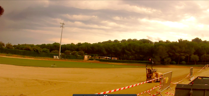 le "terrain de foot en stabilisé" a été détruit. au fond on aperçoit le gazon qui est en train d'être installé alors qu'au premier plan un engin a aplani toute la surface