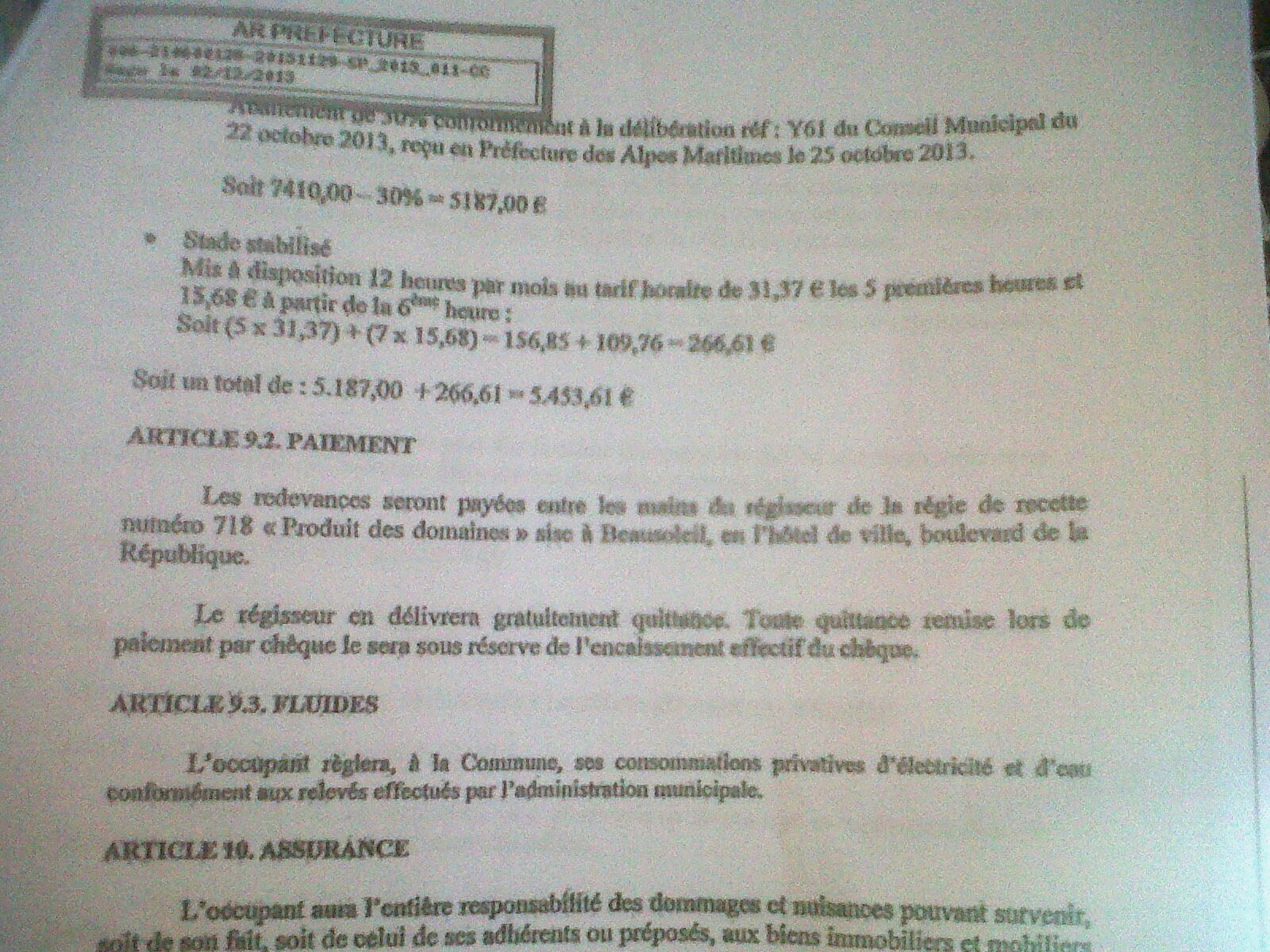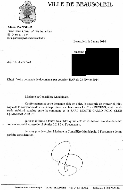 Suite au flou artistique qui règne sur la Beausoleil polo connection, et la mise à disposition par la ville de Beausoleil, au profit de la société d'organisation d'évènements liés au polo de Mr Mitrano, dans des conditions bien peu transparentes, de terrains sis sur le stade du Devens, de multiples demandes ont été adressées à Mr Spinelli maire sortant de Beausoleil . Celui ci a finalement fait donner réponse et copie d'une conventions de mise à disposition d'équipement sportifs.