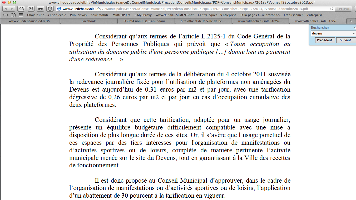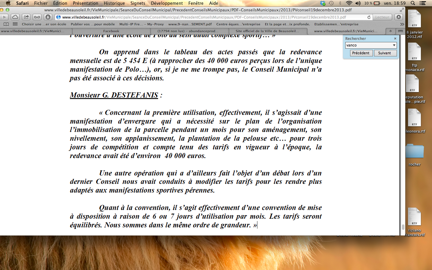 En effet, à part la vague allusion du conseil municipal de juillet 2013 et simplement après la manifestation de 4 jours tenue au mois d'août 2014, soudain le polo revient sur le tapis lors du conseil municipal du 22 octobre 2013, avec la proposition d'une baisse de tarif spectaculaire moins 30% par rapport au premier paiement de 40 000 euros ( dixit à ce point Mr Destefanis, qui quelques mois plus tôt indiquait une redevance d'environ 65 000 euros, comme on l'a signalé ci dessus) encaissés par la mairie pour la location de la parcelle sur laquelle a été crée en toute irrégularité le fameux "terrain de padock polo".