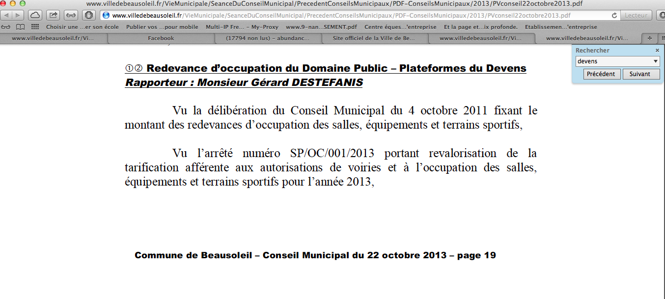 Tout commence au printemps 2013, quand sans autre forme de procès et sans qu'aucune délibération du conseil municipal ne le mentionne ( voir les liens vers des comptes rendus des différents conseils municipaux sur le site http://www.villedebeausoleil.com ) , le terrain de foot de 66X46m en stabilisé qui se trouvait à l'entrée du stade du Devens, et qui avait coûté 130 000 euros aux beausoleillois lors de sa construction en 2003, est rasé!